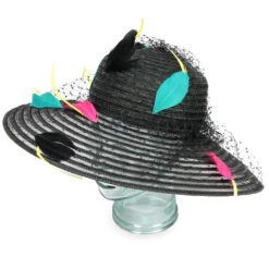 Designed by Emma B for Giovannio Hats, the Aviary is a wide brim dress hat made of fine crinoline and matte braid. Multi-colored assorted feathers float on airy birdcage netting that surrounds the crown and brim. The inner band hides an adjustable drawstring that can be tightened for a smaller fit.