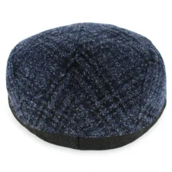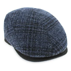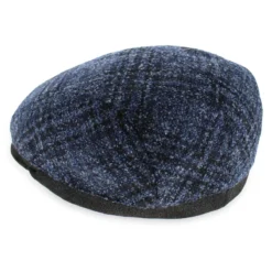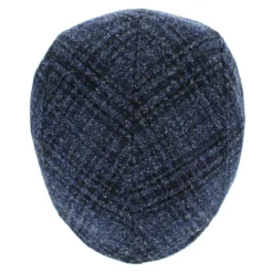 The Belfry Coletti is a refined flat cap made of a wool blend in a subtle blue/black plaid, enhanced with a black leather bill and trim. The center seam gives this cap a slightly raised profile, similar to a pub style.
