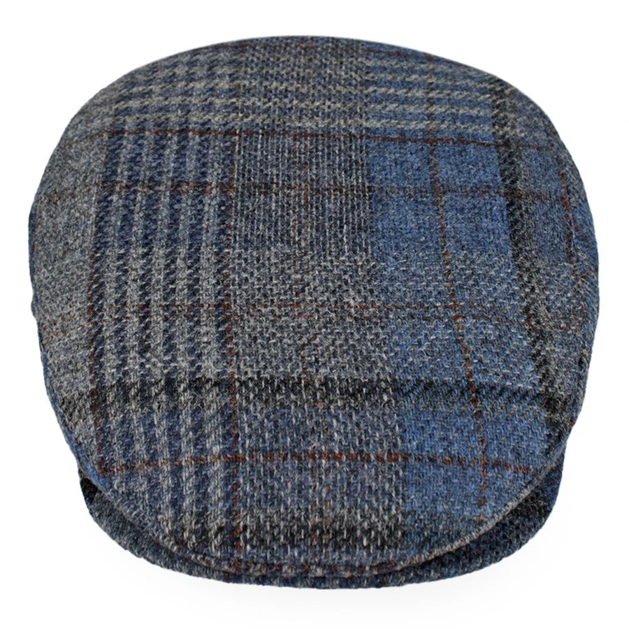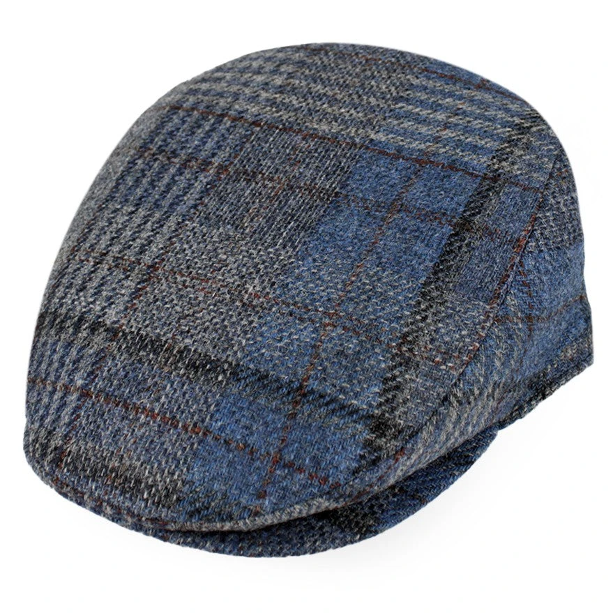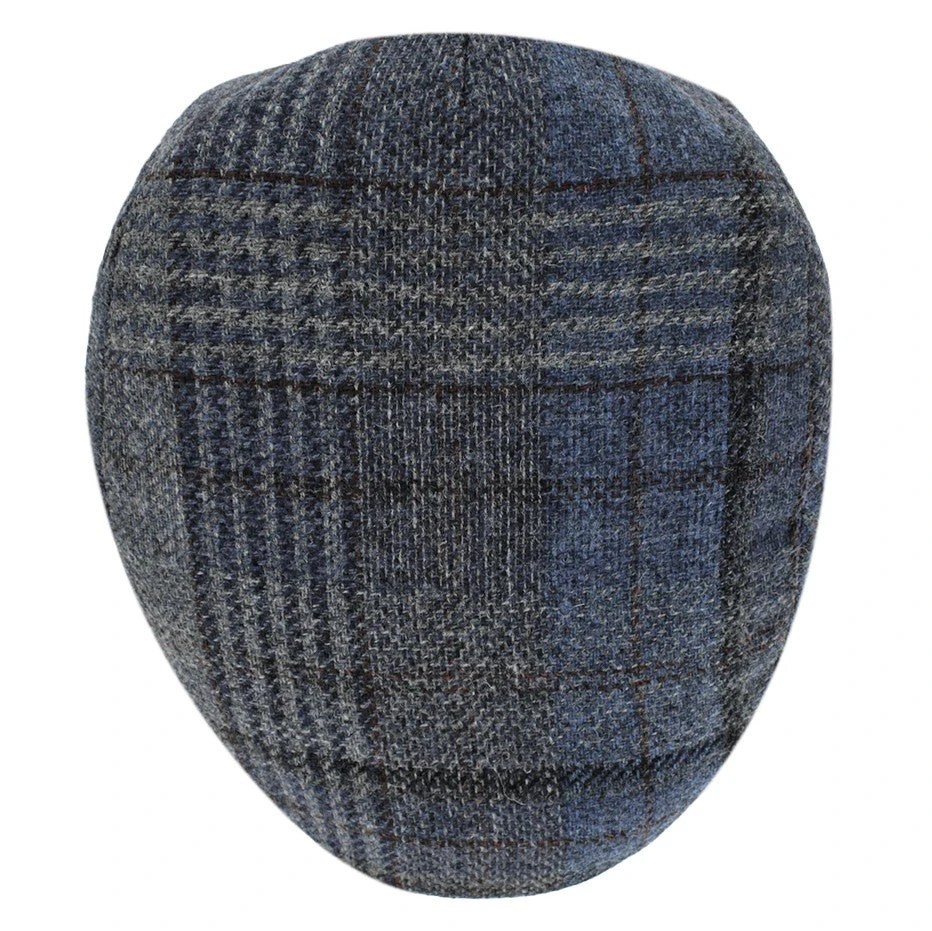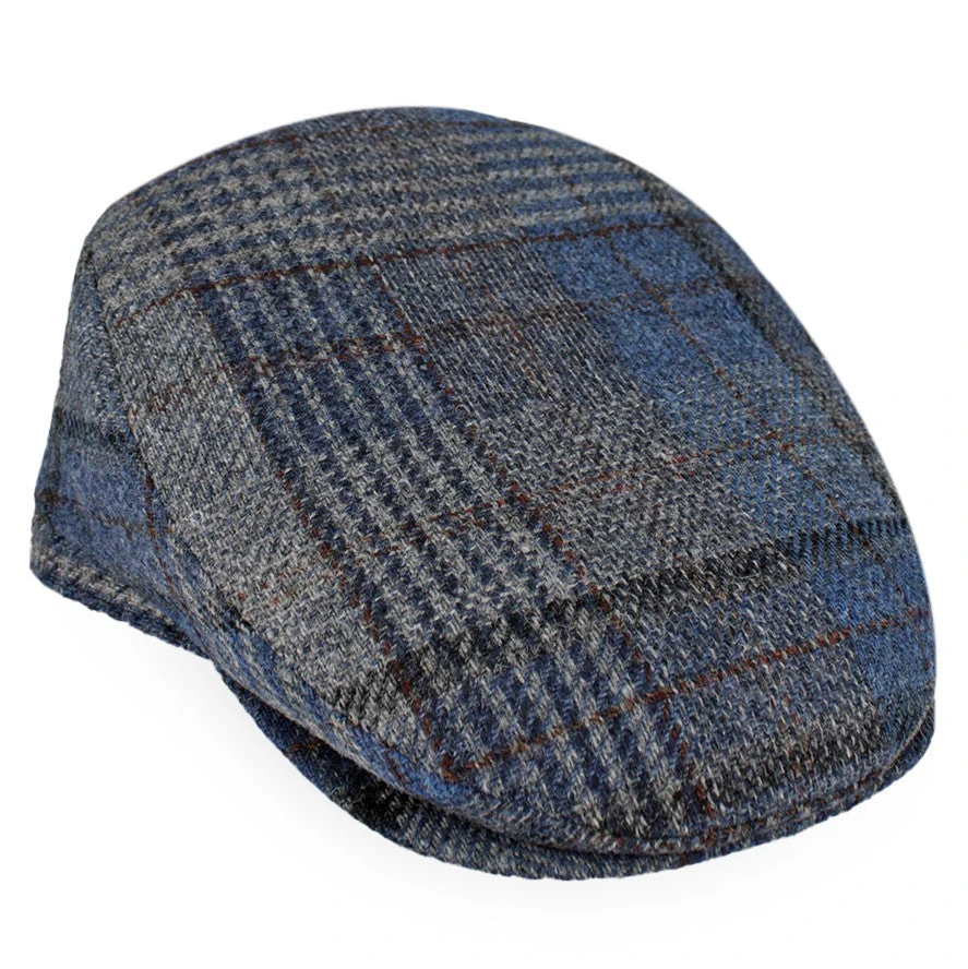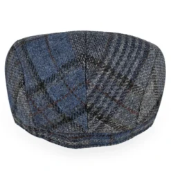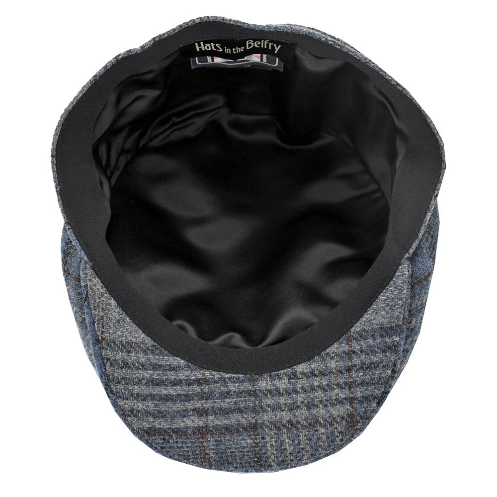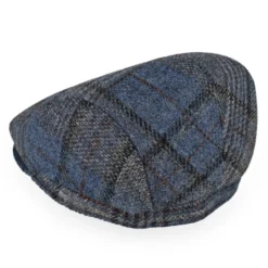 The Belfry Corby is a classic flat cap made of a lightweight wool in a plaid pattern of blue, tan, and black. Fully lined, the Corby transitions easily from fall to spring.