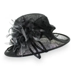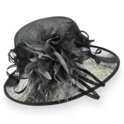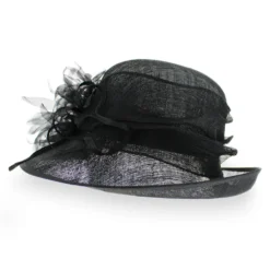 Look and feel gorgeous this spring in the Belfry Enrica dress hat from Complit Hats of Italy. This stylish design features an asymmetrical brim that dips alluringly around your face, a wide pleated hat band with loops and a beautiful hand-cut net flower. The inner band has an adjustable drawstring that can be tightened for a secure fit. Made of 100% Sinamay straw, the Enrica is both lightweight and airy, keeping you cool and comfortable all day.