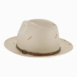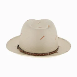 Spend your summer in this one-of-a-kind fedora! Featuring a unique random stitch pattern throughout the crown and brim, the Belfry Grosso is made of lightweight paper braid straw that will keep you comfortable and cool on hot summer days. The casual vibe of the Grosso is enhanced by the narrow leather and metal embossed hat band. Designed by Tesi Hats of Italy.