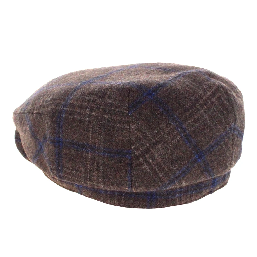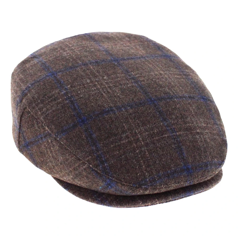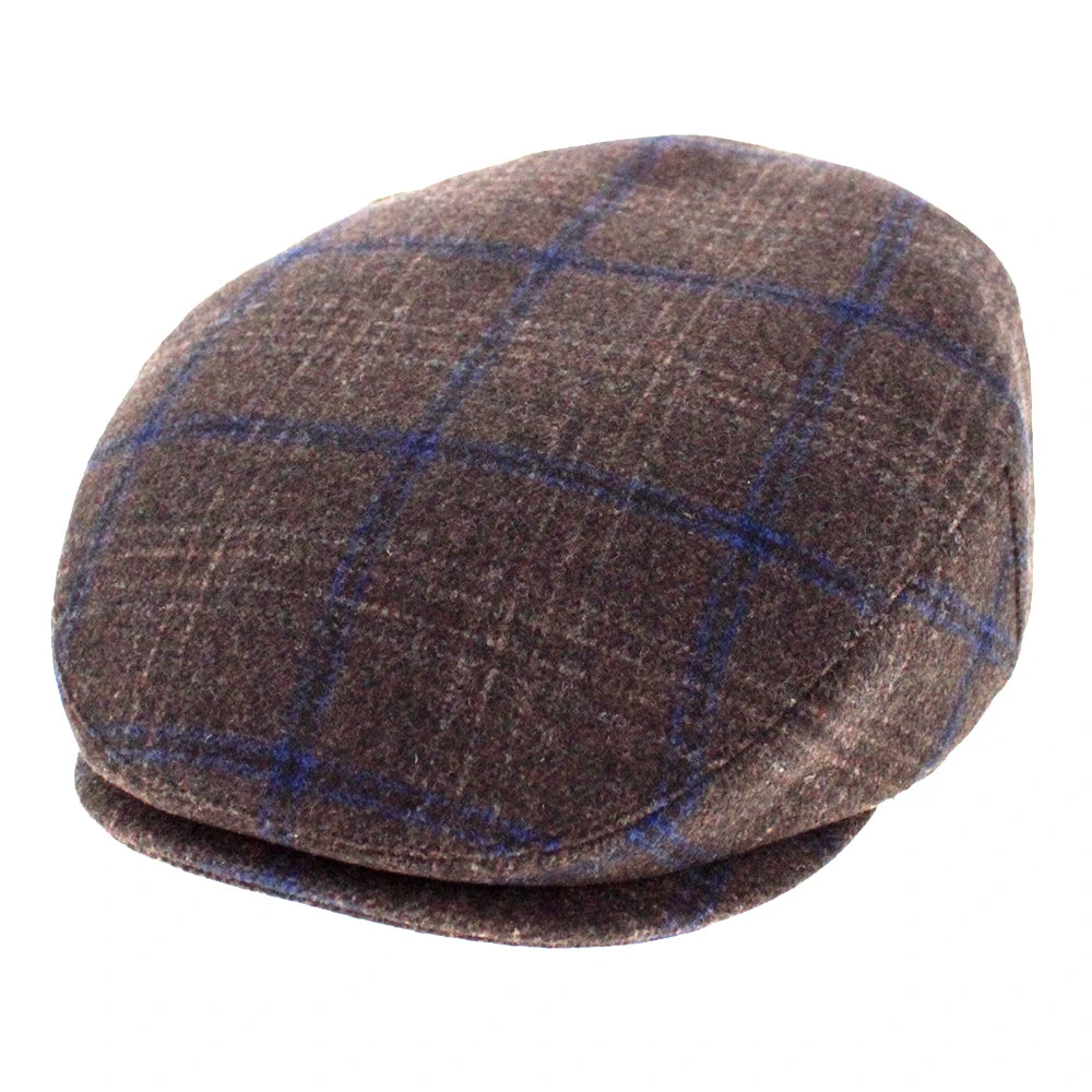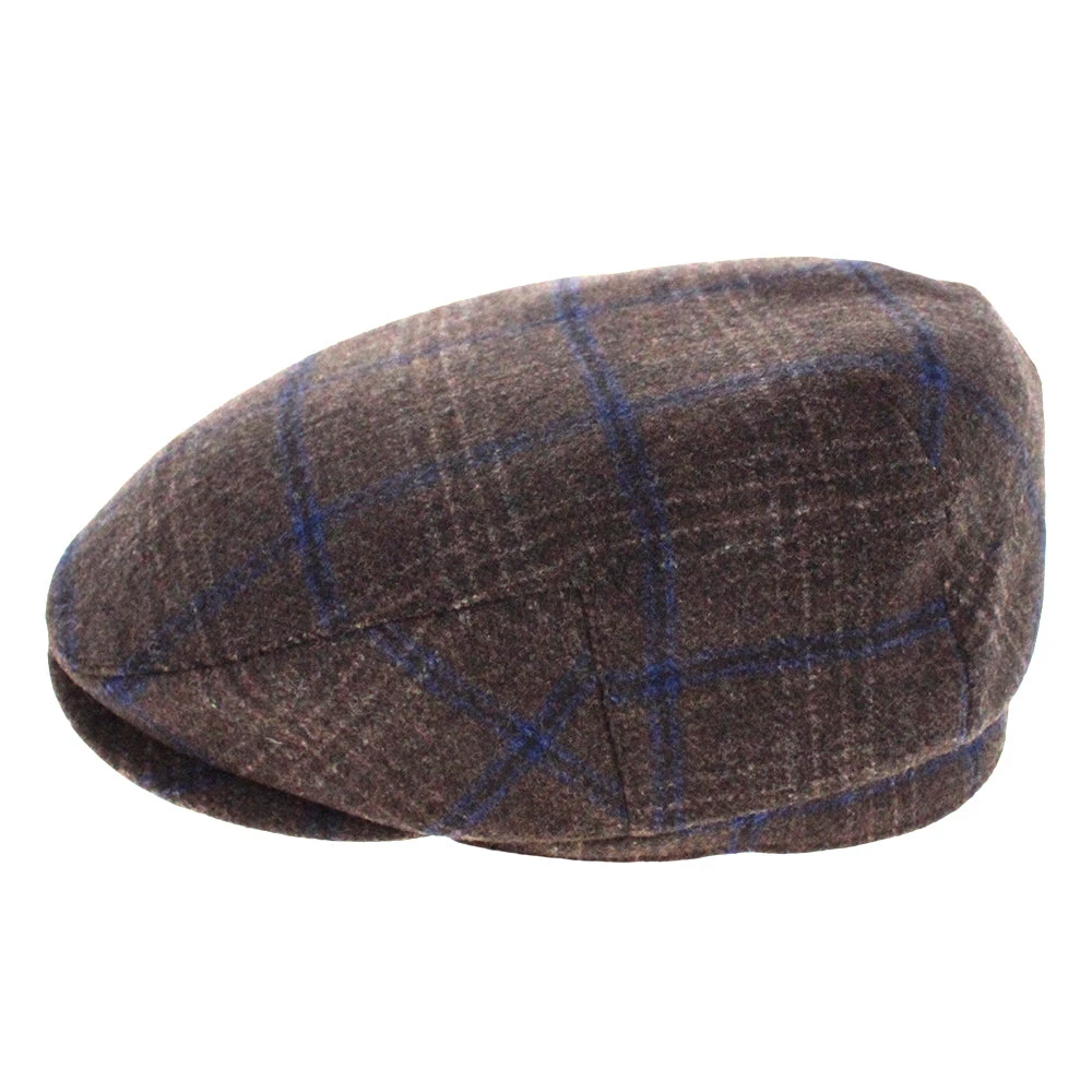 The Belfry Kayne is an affordable traditional flat cap made of a soft mid-weight polyester/wool blend. It features a subtle windowpane plaid with dominant colors of brown and blue. Â