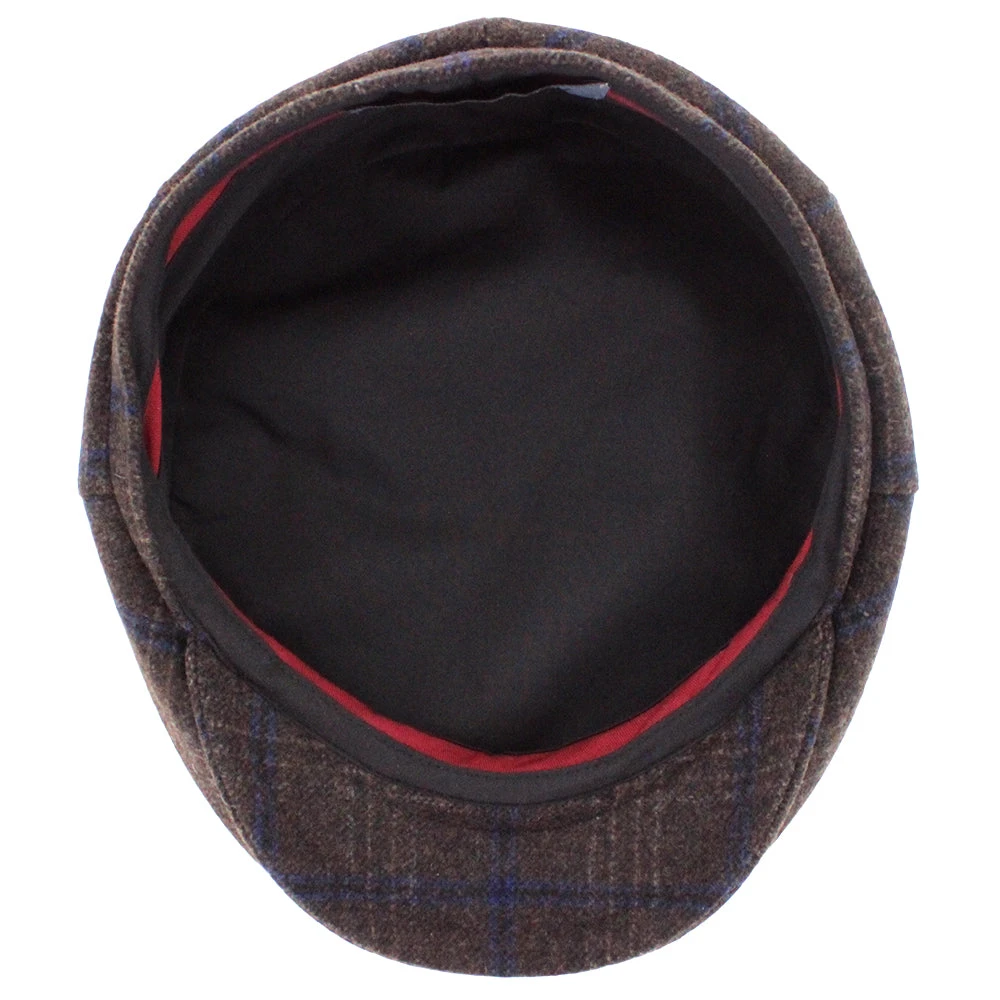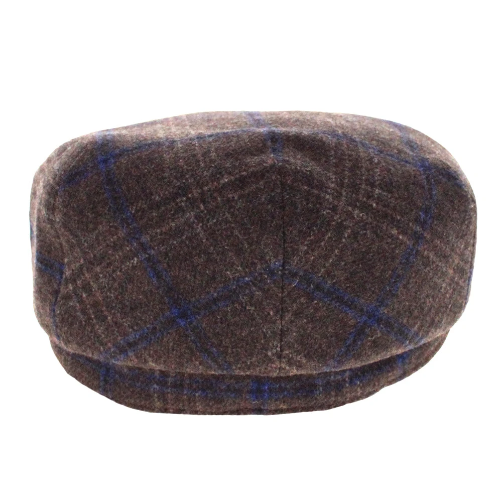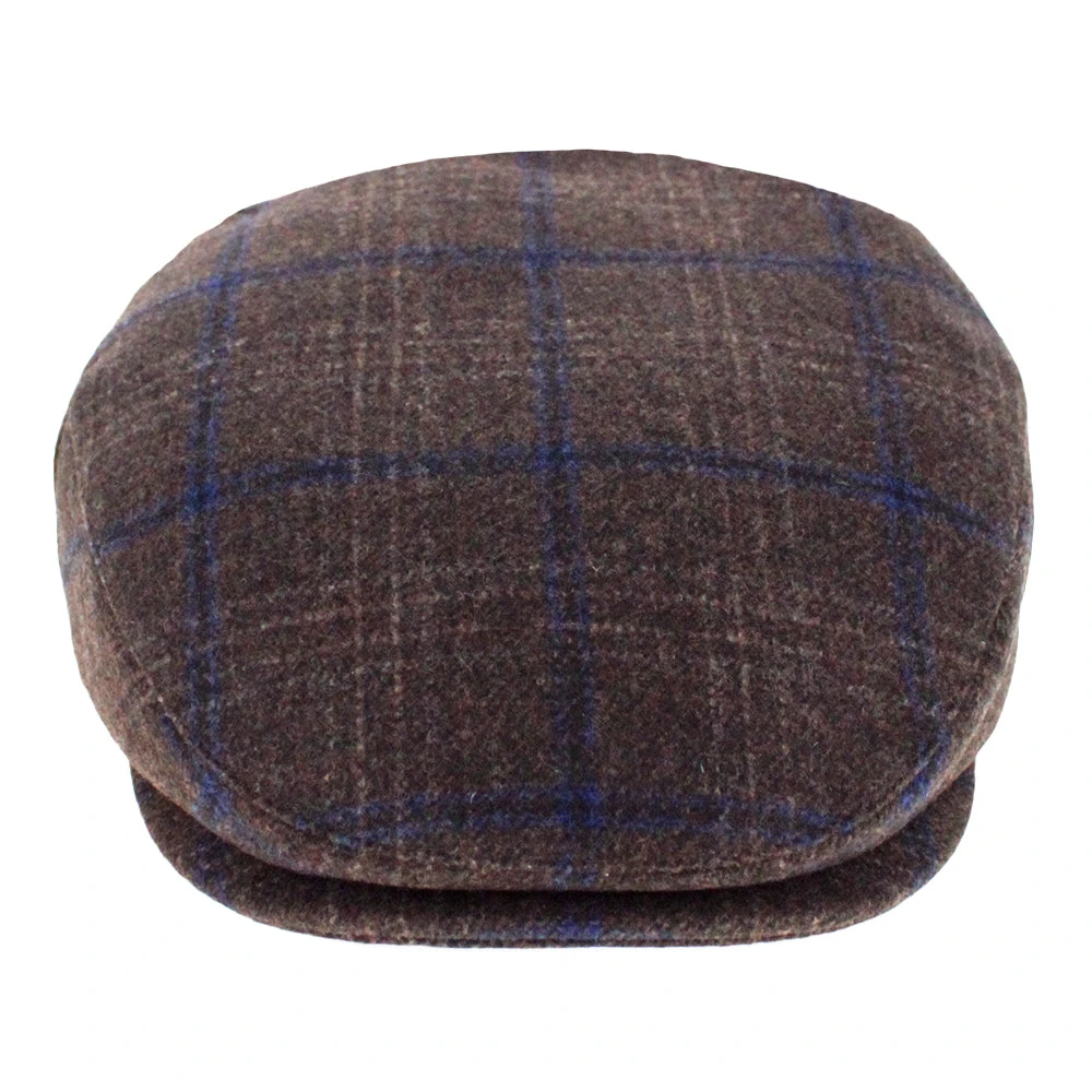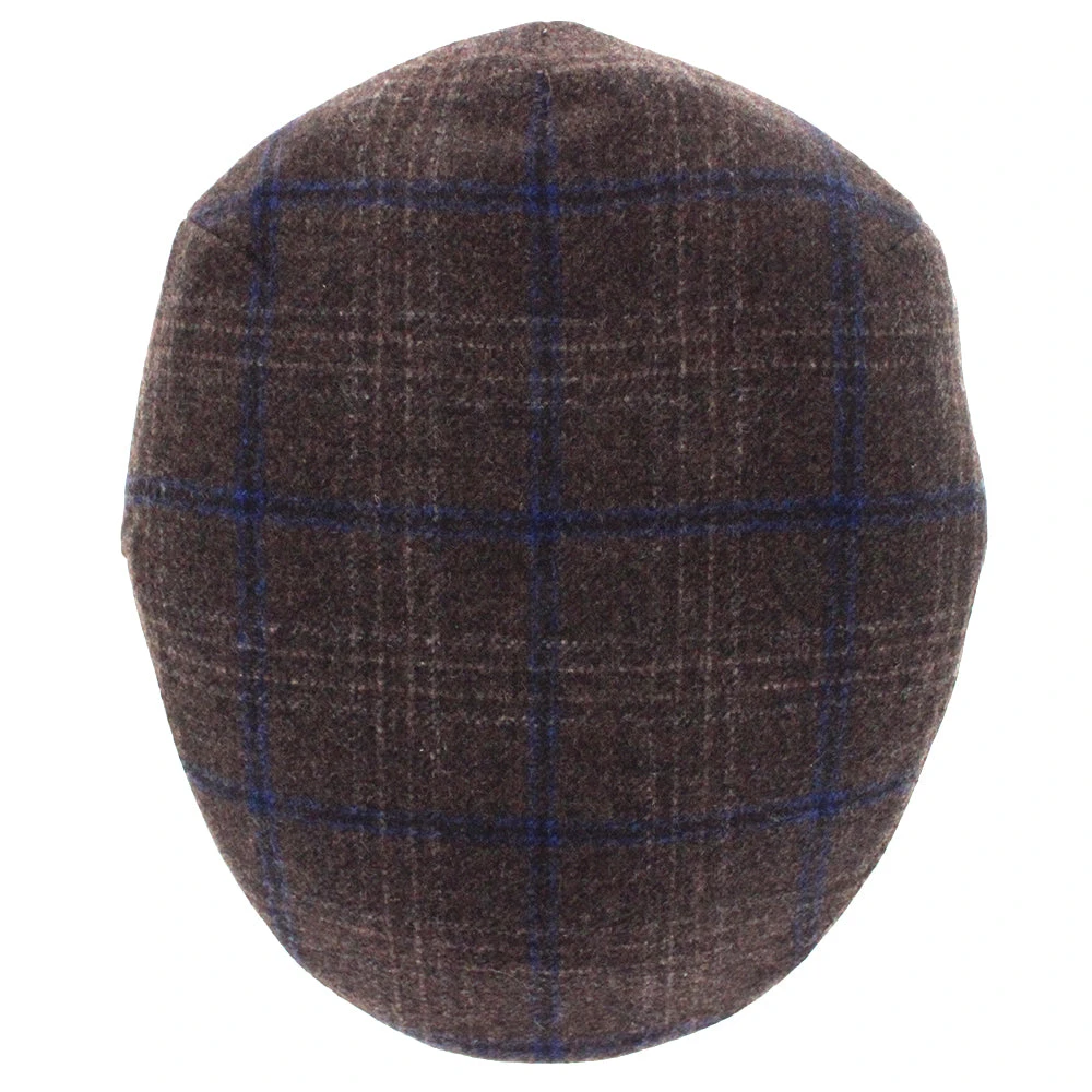 The Belfry Kayne is an affordable traditional flat cap made of a soft mid-weight polyester/wool blend. It features a subtle windowpane plaid with dominant colors of brown and blue. Â