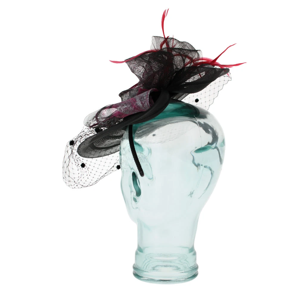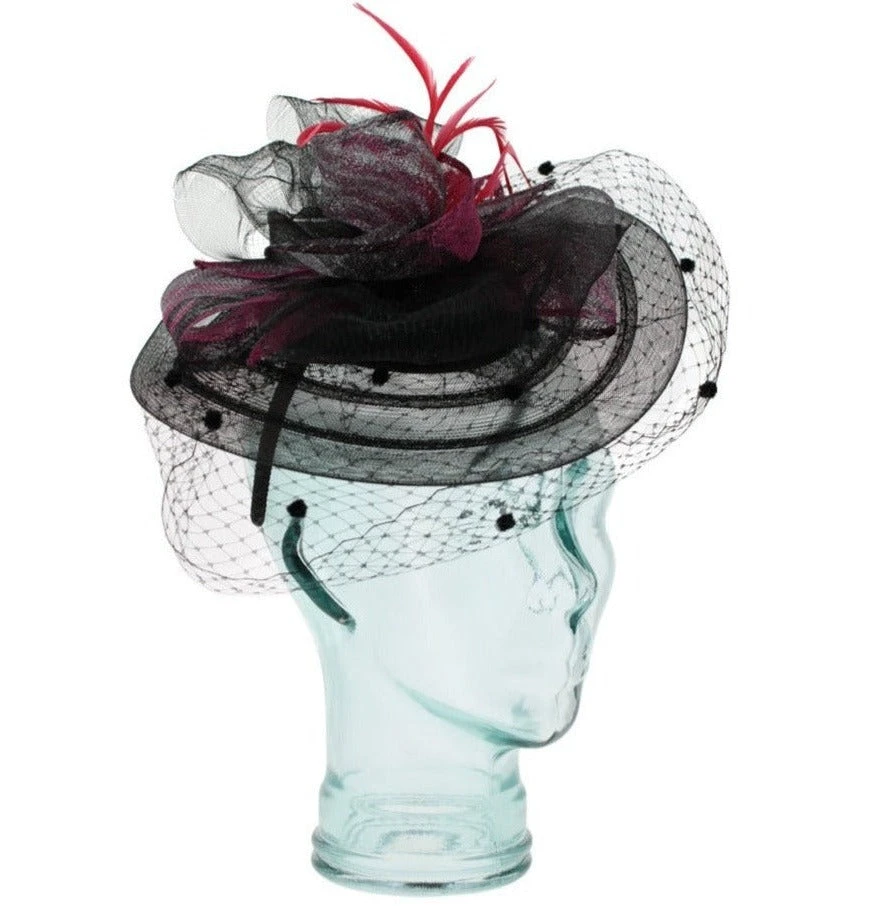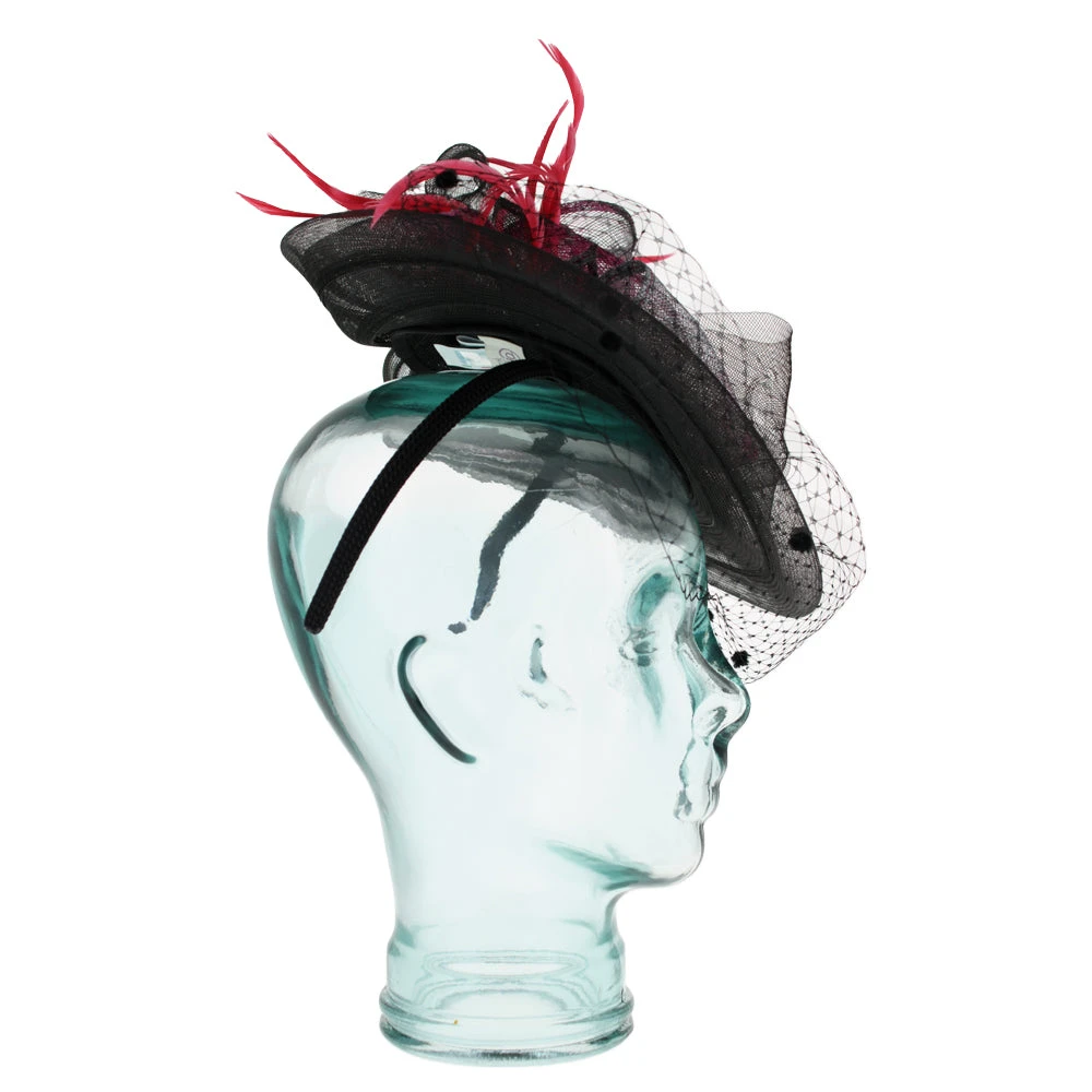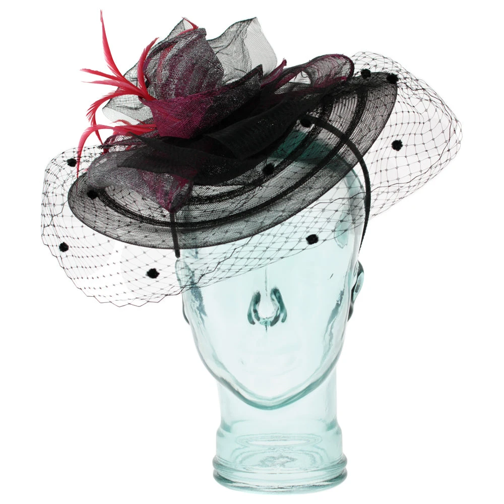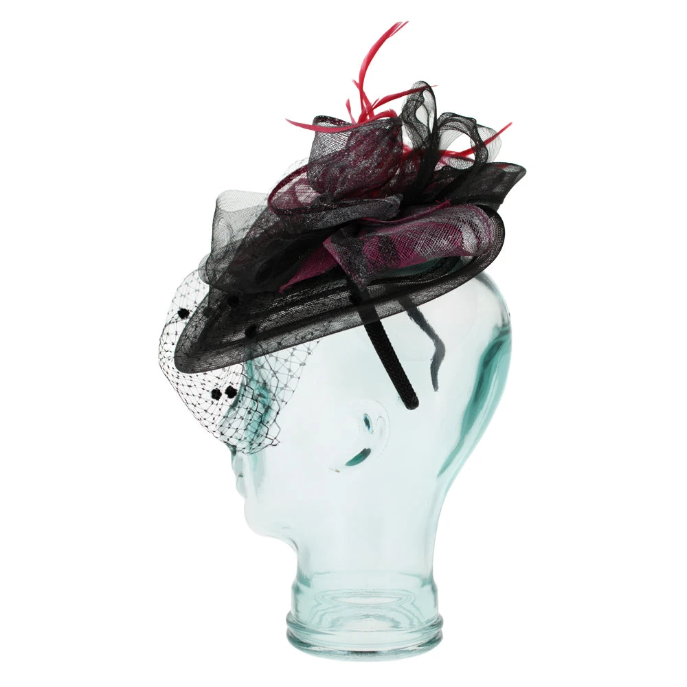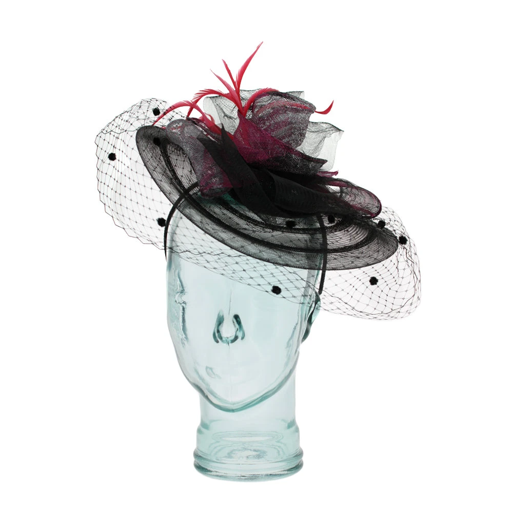 Capturing the essence of glamour, the Belfry Luiga defines elegance with its artistic details. Gently resting on its sinamay and sisal base, a hand-painted sinamay bow is hand folded into a floral rosette. Birdcage netting falls seductively about the face and is festooned with small pompoms. The removable headband can be adjusted into different positions for a variety of looks.