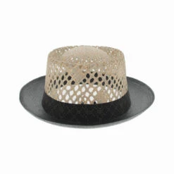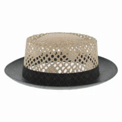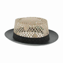 This sharp-looking pork pie with its distinctive vented crown and two-tone color scheme, is versatile enough for dress or casual wear. The oval seagrass crown features a decorative open weave for maximum air flow and is surrounded by a stencil-printed hat band. The black brim is made of paper straw with a classic curled edge. Top off a summer suit with this dapper hat and instantly elevate your personal style. Created by Tesi Hats of Italy.