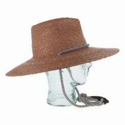The Belfry Matera is a versatile, protective sun hat made of all natural raffia straw, dyed a rich tobacco color. It features a pronounced pinch front crown and a rope necktie to hold it firmly in place. Flexible enough for total comfort, the Matera holds its safari shape, due to its medium-weight straw body. Designed by Ferruccio Vecchi of Italy.