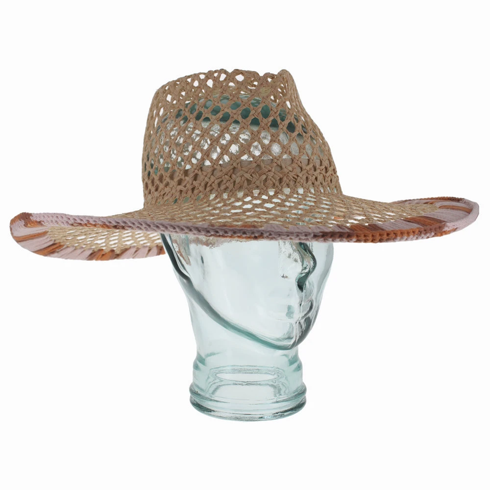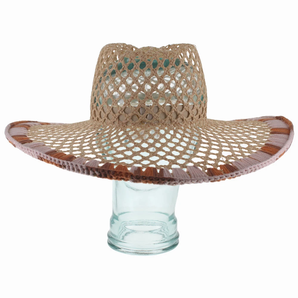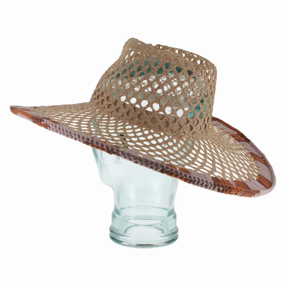 The Belfry Monalisa offers the glamour of an oversized hat, without the weight of a wide brim style. This safari hat is trimmed with a crocheted brim edge of earth-tone colors that add depth and interest to the wide open weave. Designed by Ferruccio Vecchi of Italy, this uniquely stylish hat will add a fashionable touch to a summer ensemble