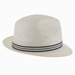 The Belfry Olmi is a clean-cut trilby hat, an informal alternative for those who want a classic style with a contemporary look. Made of lightweight shantung straw, the Olmi is woven in an alternating linear and diamond pattern, which gives this hat a textured finish. A narrow grosgrain ribbon hat band in neutral stripes allows this smart-looking hat to blend well with dress or casual attire. Created by Tesi Hats of Italy.