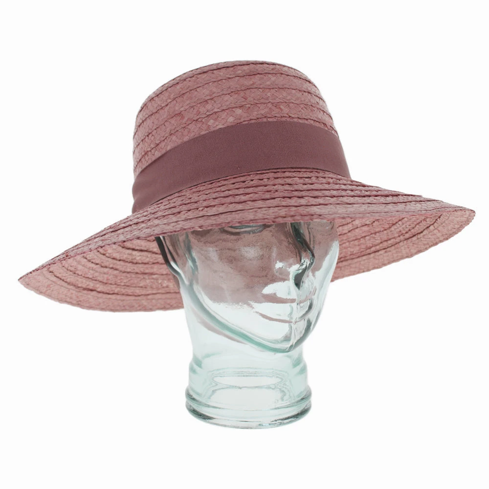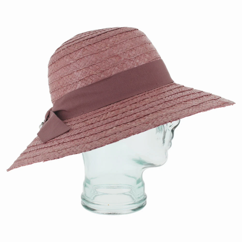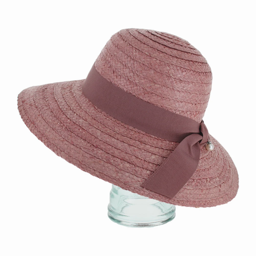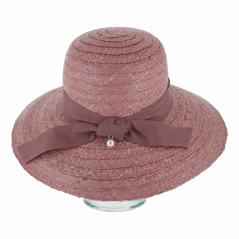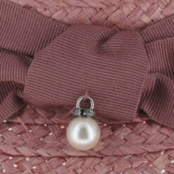 The Belfry Rosalba is a wide brim fedora that feels carefree and light as air. Made of all natural breathable straw in a muted rose color, this hat will take you anywhere in fashionable style. The dyed-to-match hat band is tied in a simple bow with a drop pearl accent. The Rosalba is casual enough for a day on the boardwalk, yet is dressy enough for a summer wedding.