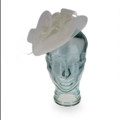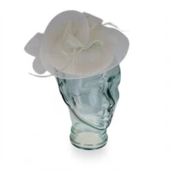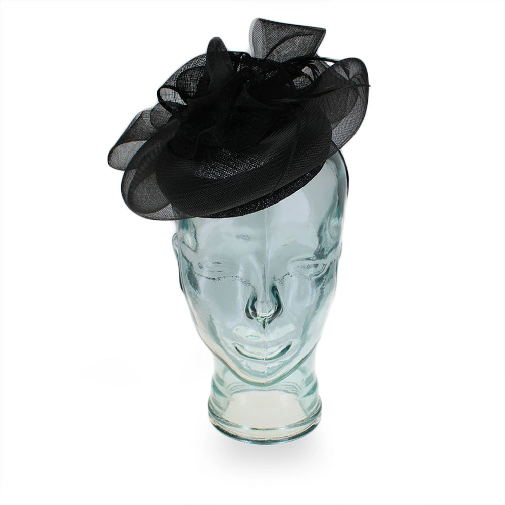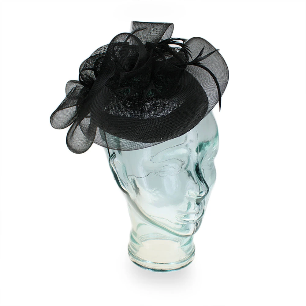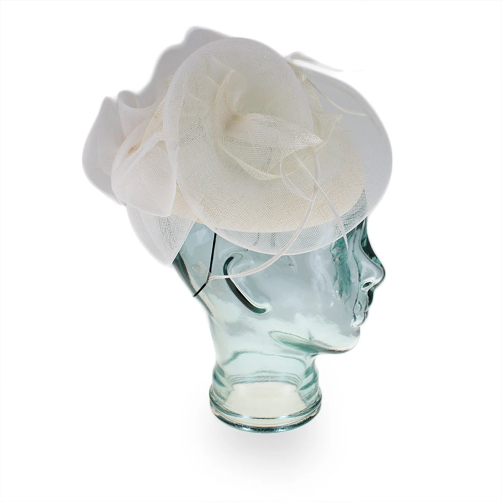 Inspired by Paris in the 1920’s, this elegant fascinator offers a sophisticated look with vintage style. Designed by Complit of Italy, the Simona is made of lightweight mesh Sinamay swirled onto the pillbox base, which then spirals into a multi-faceted bow with rosette flower accents. Just a few well-placed feathers adorn this beautiful fascinator and add gentle movement.Â