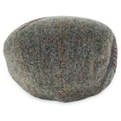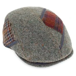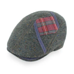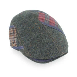 The Belfry Zampa is a modern flat cap made of Italian wool, sewn in a contemporary patchwork grid with top stitching and denim accents. The sewn brim is trimmed with the same denim fabric and contrasting top stitching.