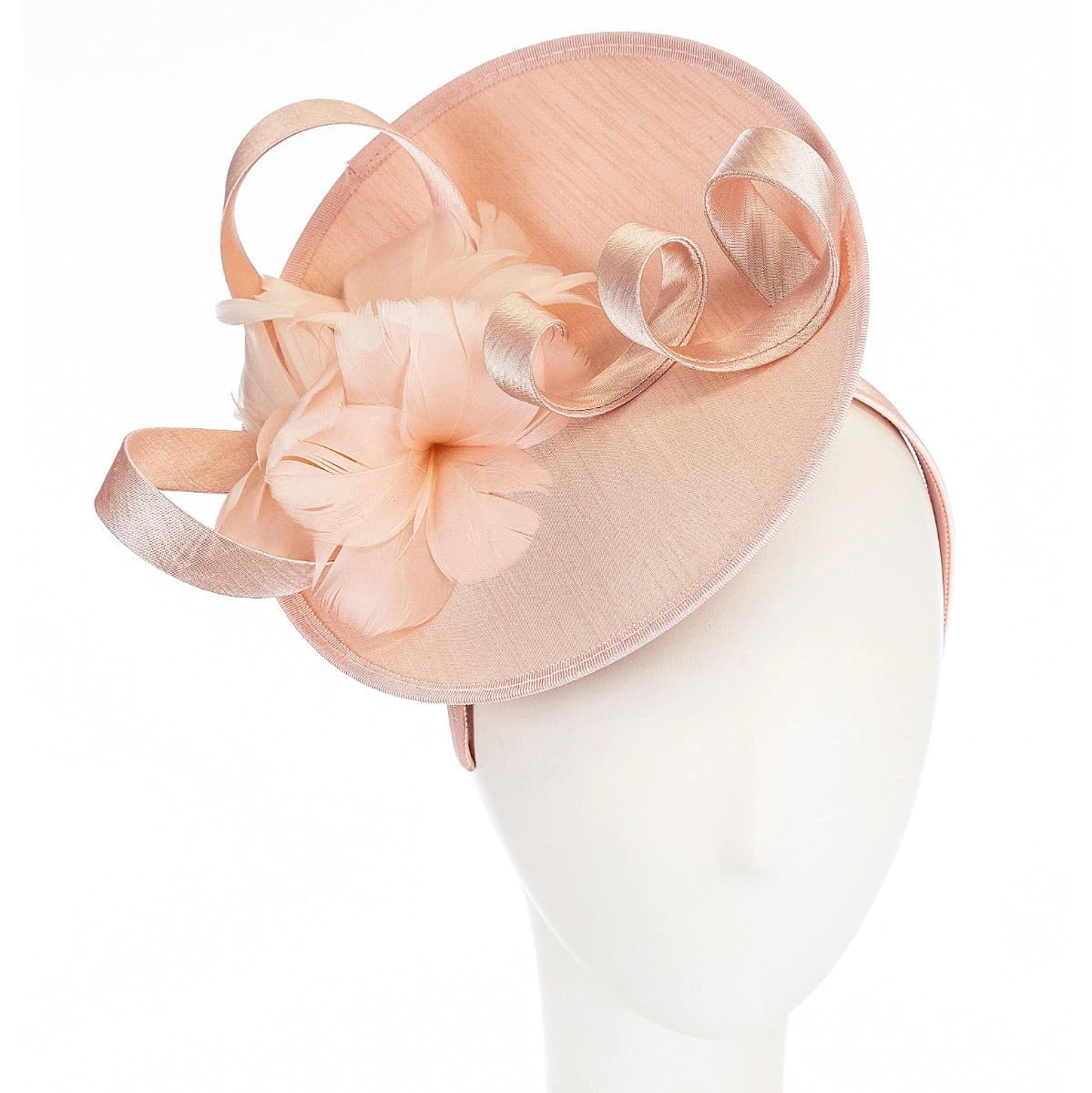 Designed by Giovannio, the Ramona is a delightful saucer fascinator designed and hand formed of Shantung straw. Handmade feather flowers and Shantung looping has been added as accents. This lovely fascinator is worn tilted to the side and held in place by a fabric covered headband. Princess Kate was recently photographed wearing a fascinator of this style.Â