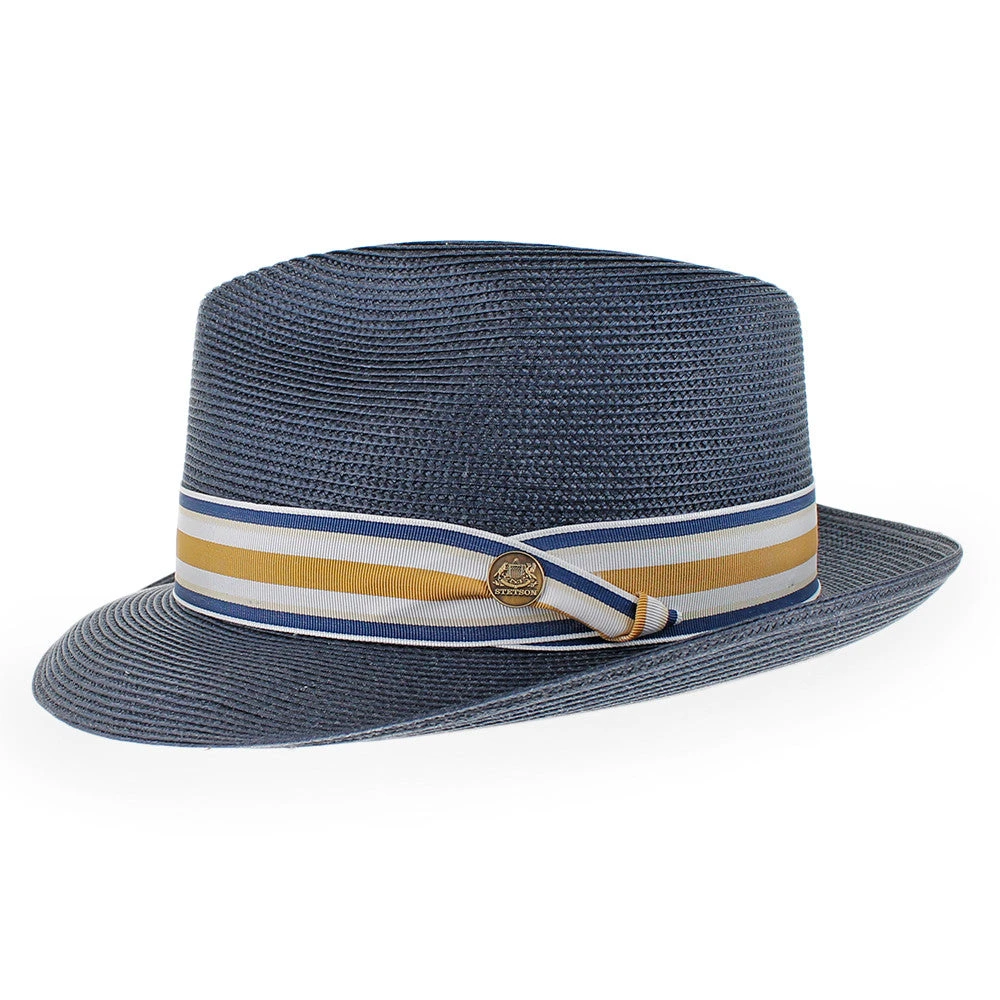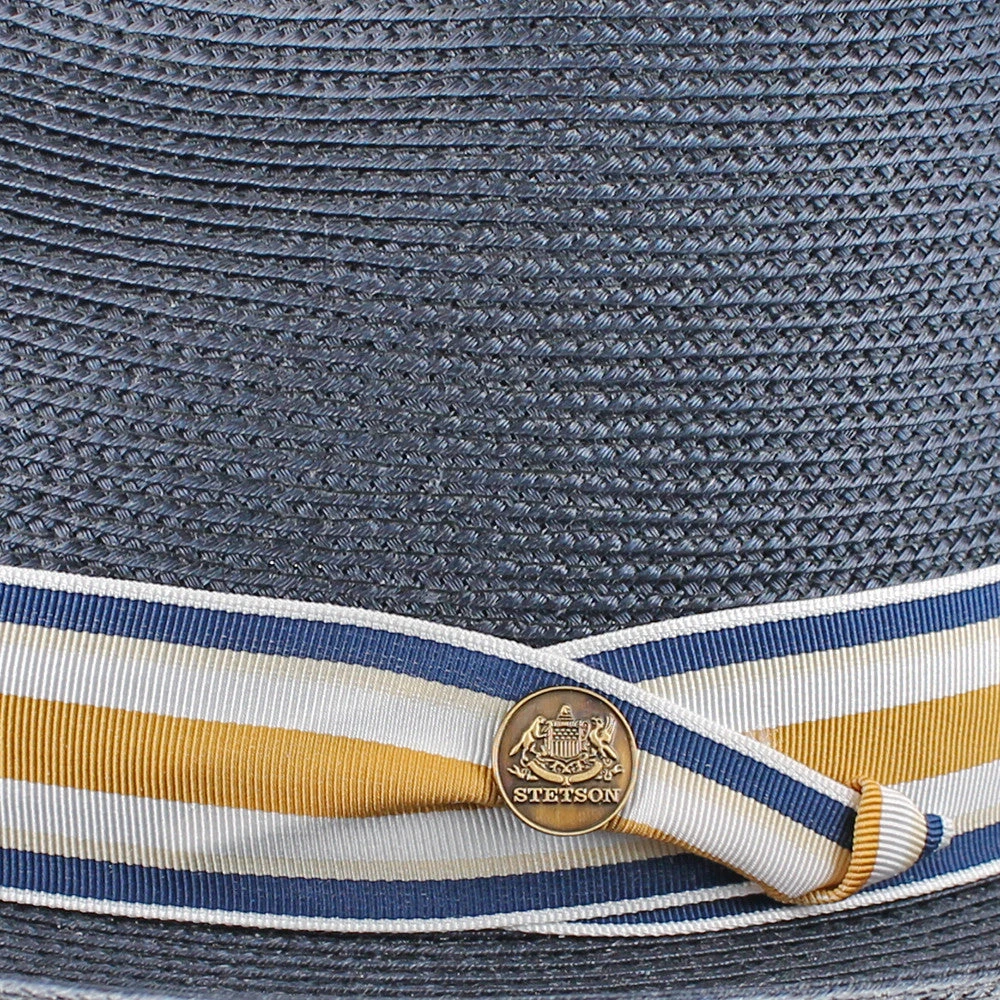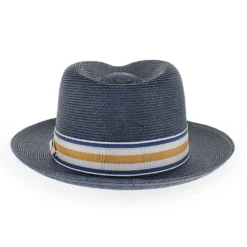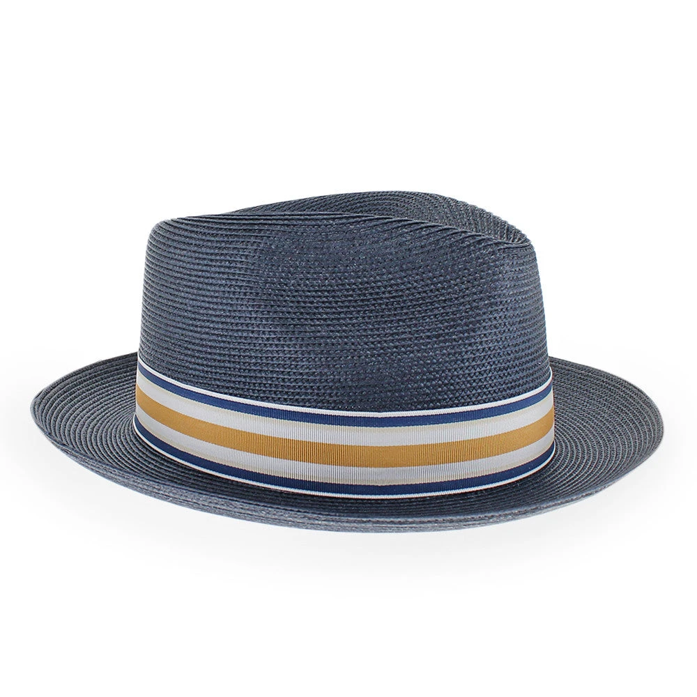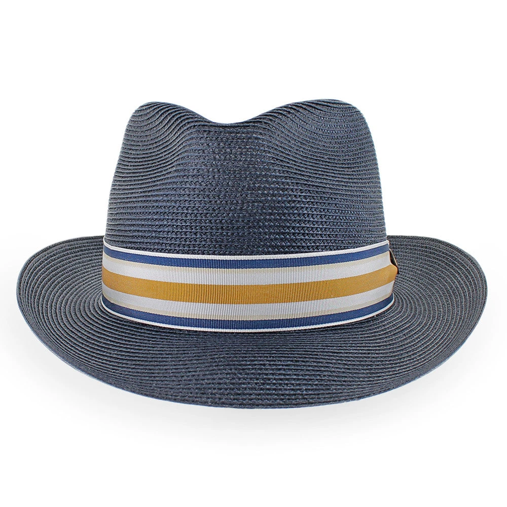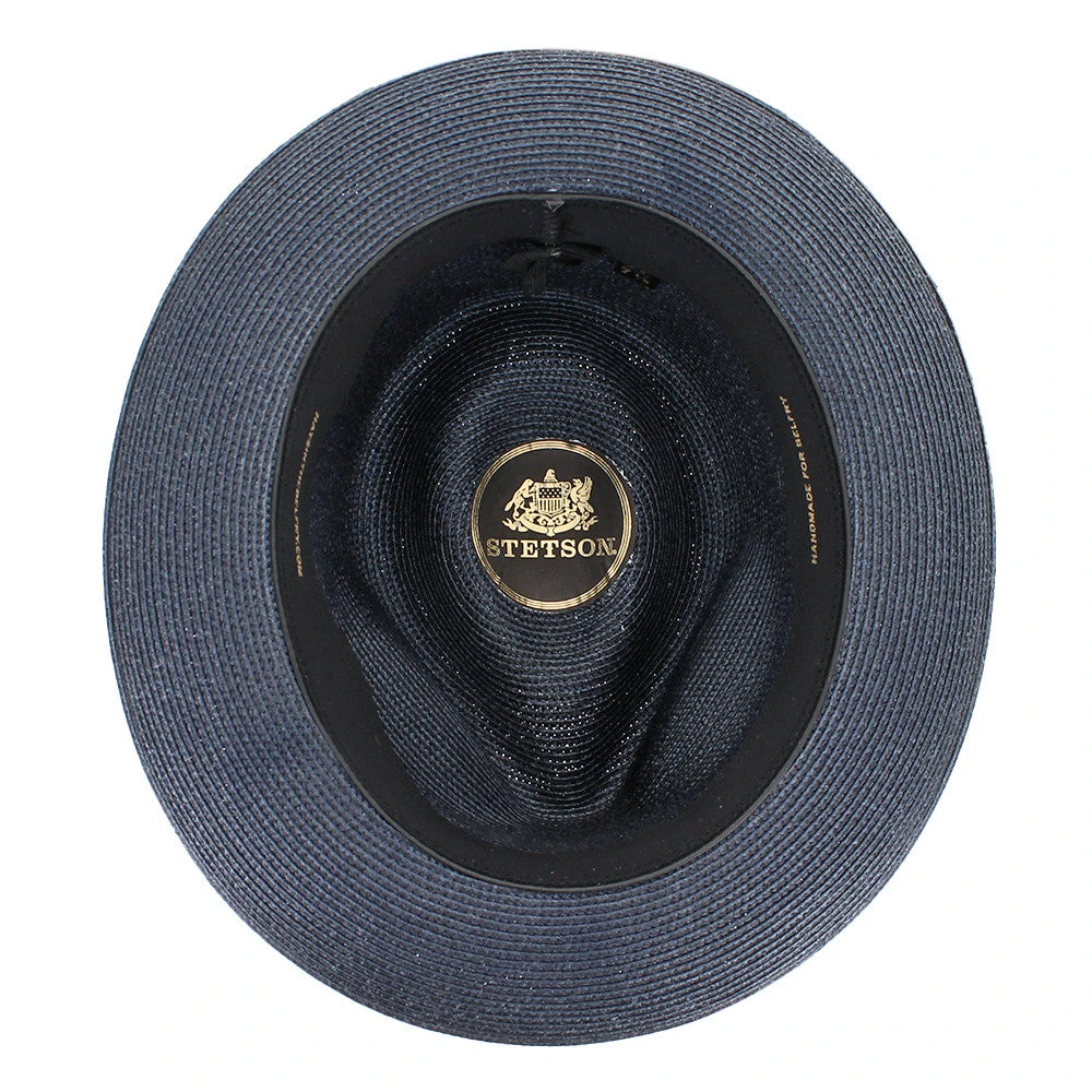 The Belfry Copley is handcrafted of woven poly braid straw in a rich navy hue. The brim may be snapped up or down for two different looks and the unlined interior offers a German inner band that wicks away moisture.