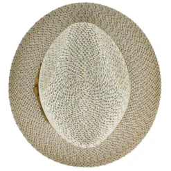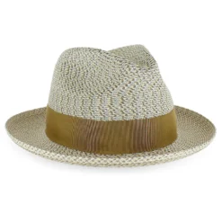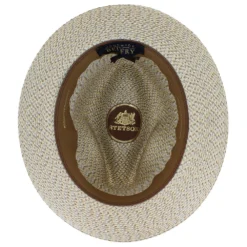 With its multi-patterned body and color-coordinated hat band, the Belfry Kegan can top off casual or dress attire with ease. Made of resilient woven poly braid, this fedora is flexible, durable and resists stretching. The Kegan features a woven pattern of gold, beige and brown, and the brim may be snapped up or down for two different styling options. Handmade in the USA by Stetson, this unique fedora showcases true American craftsmanship.