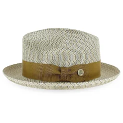 With its multi-patterned body and color-coordinated hat band, the Belfry Kegan can top off casual or dress attire with ease. Made of resilient woven poly braid, this fedora is flexible, durable and resists stretching. The Kegan features a woven pattern of gold, beige and brown, and the brim may be snapped up or down for two different styling options. Handmade in the USA by Stetson, this unique fedora showcases true American craftsmanship.