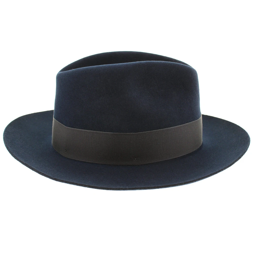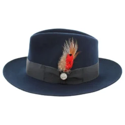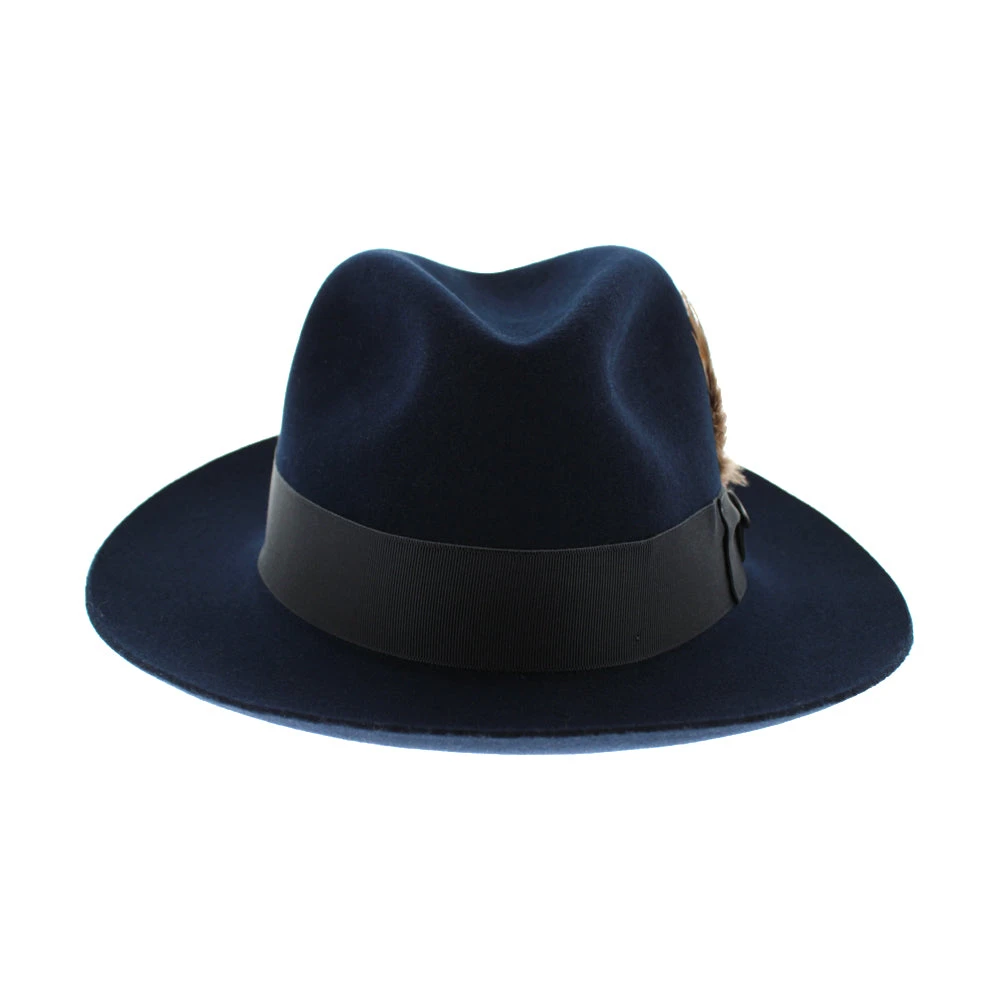 This classic fedora is made of 100% fur felt, a naturally water repellent and durable fabric. The Stetson Tru Blu is a true deep navy, rich in tone. The interior features a satin lining and a genuine cowhide leather inner band.