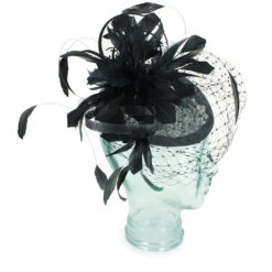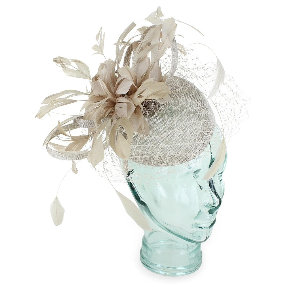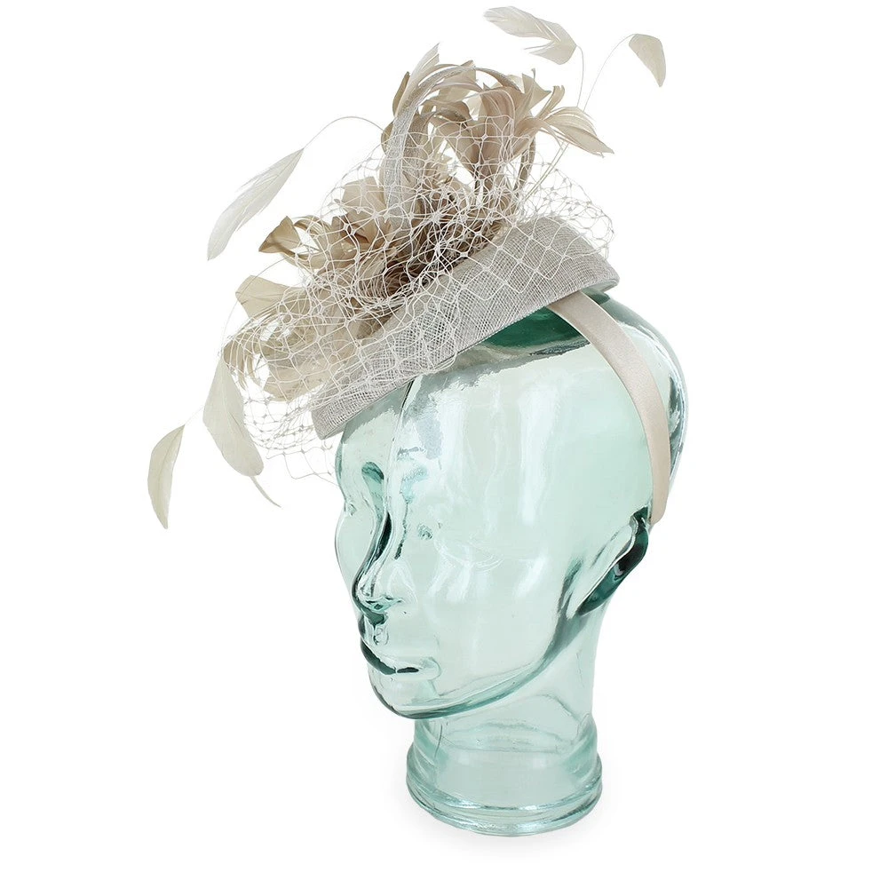The Victoria is a beautifully designed pillbox fascinator that features an open birdcage netting, hand dyed feather flowers, wispy feathers, looped sinamay swirls, and rhinestone embellishments. A fabric covered headband holds the Victoria in place.